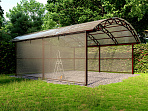 Стропильная ферма гарантирует дополнительную защиту автотранспорта от непогоды. Арочная форма кровли не дает шанса излишкам жидкости или снега задерживаться на кровле, что обеспечивает простоту ухода и герметичность кровельной поверхности. Устойчивая и надежная металлоконструкция с опорными столбами 80*80 выдержит сильные нагрузки и ураганные порывы ветра, специальная обработка материала не позволяет строению ржаветь. Навес из поликарбоната обеспечивает не только защиту от капризов погоды, но и препятствует проникновению вредоносного ультрафиолета.