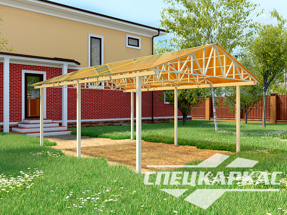 Десятки вариантов двухскатных навесов из поликарбоната. У завода «Спецкаркас» вы можете купить конструкции для террасы, бассейна, автопарковки, мангала! При выезде до 20 км от Москвы доставка и установка под ключ — за счёт компании.